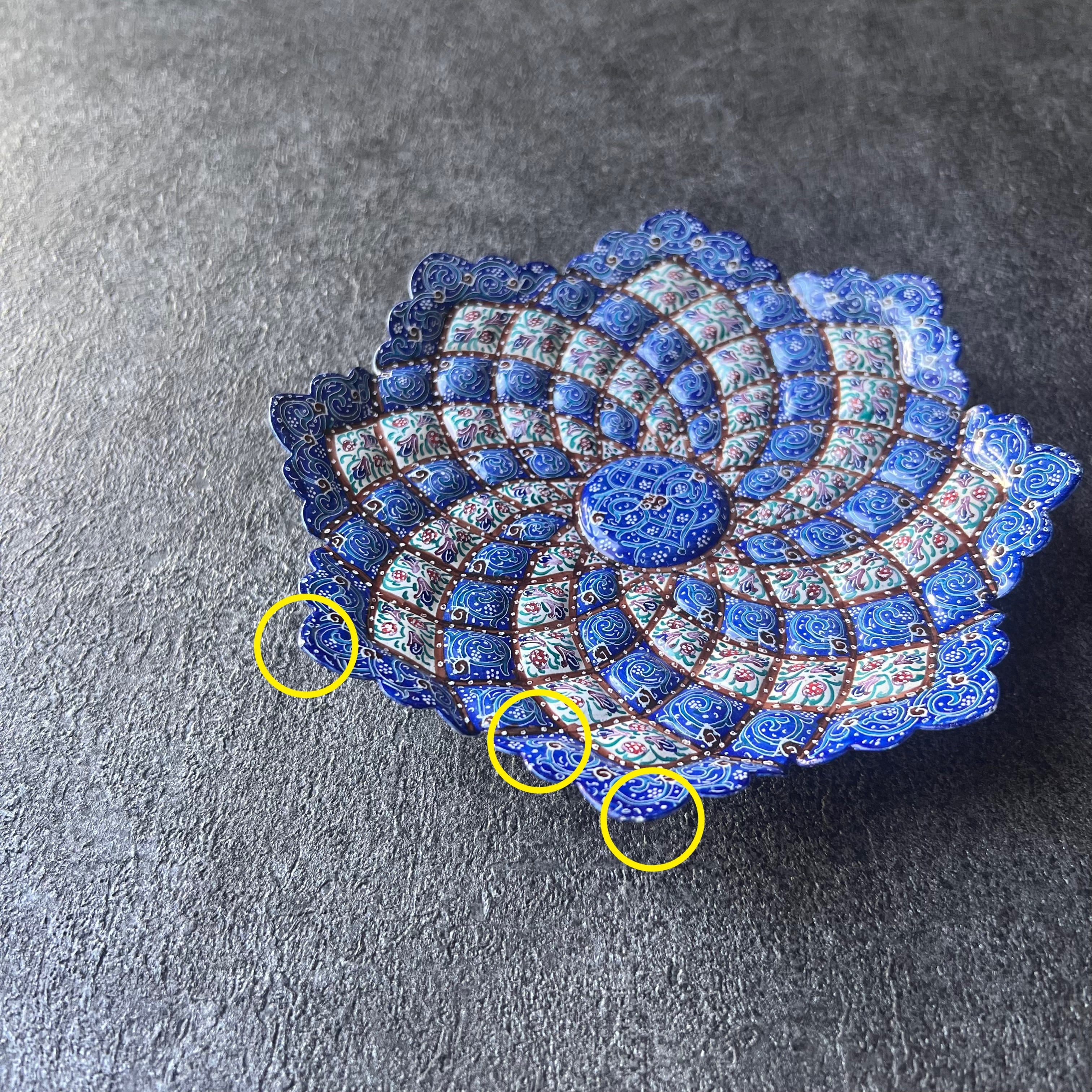 銅の素地にエナメル彩色されたブルーが印象的なお皿です。